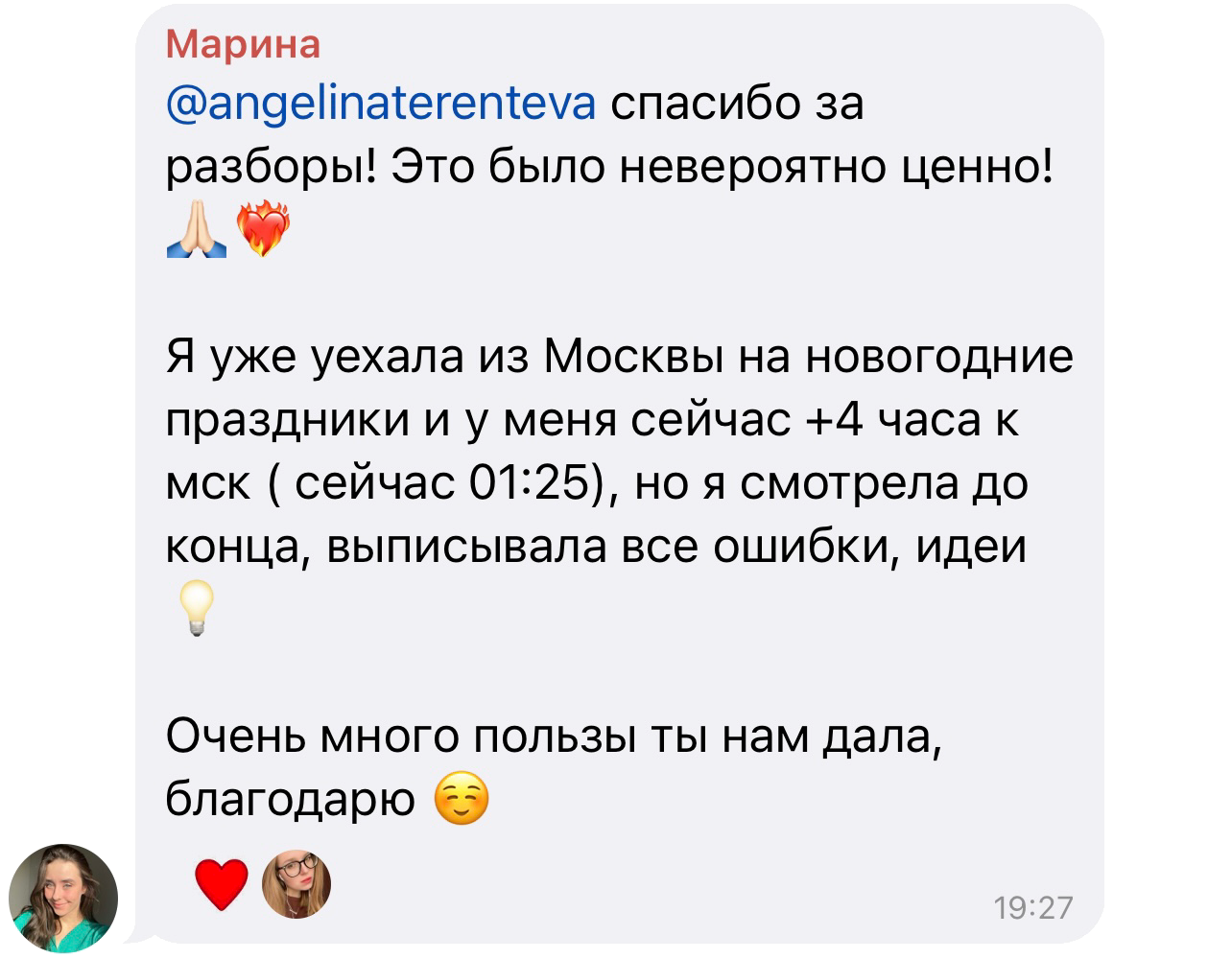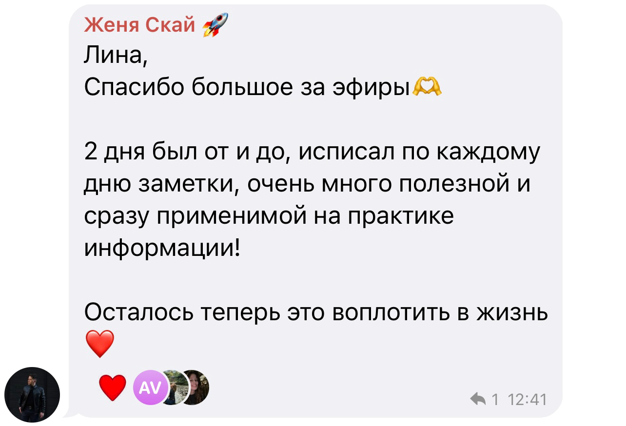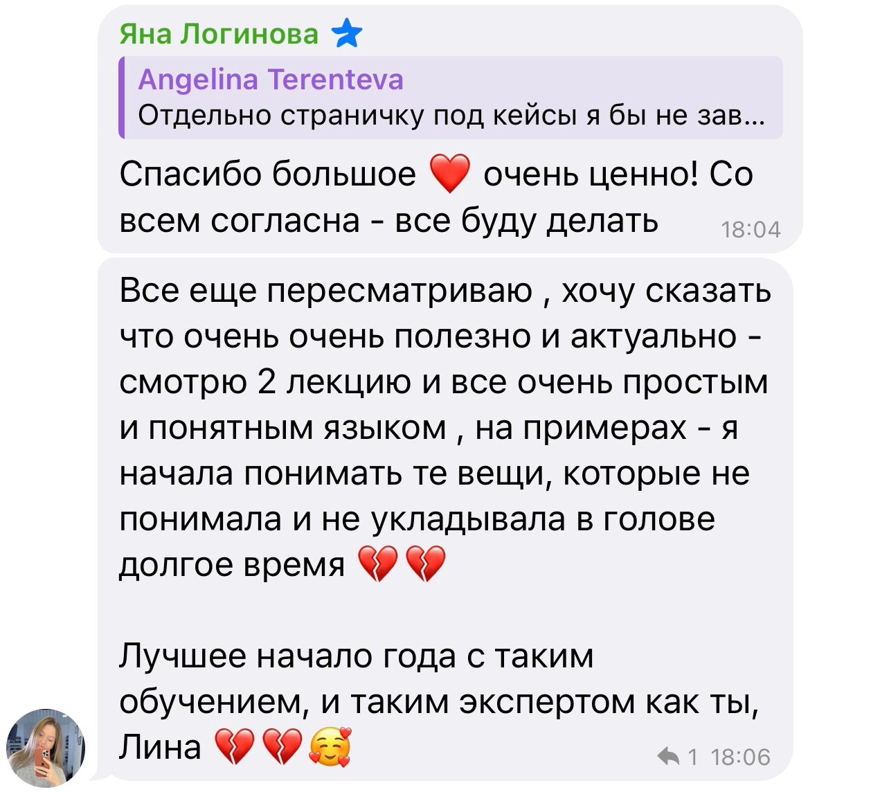 «Очень понравилась обратная связь и даже тот факт, что интенсив давно закончился, а чат до сих пор жив, и Лина сама продолжает отвечать на сообщения»