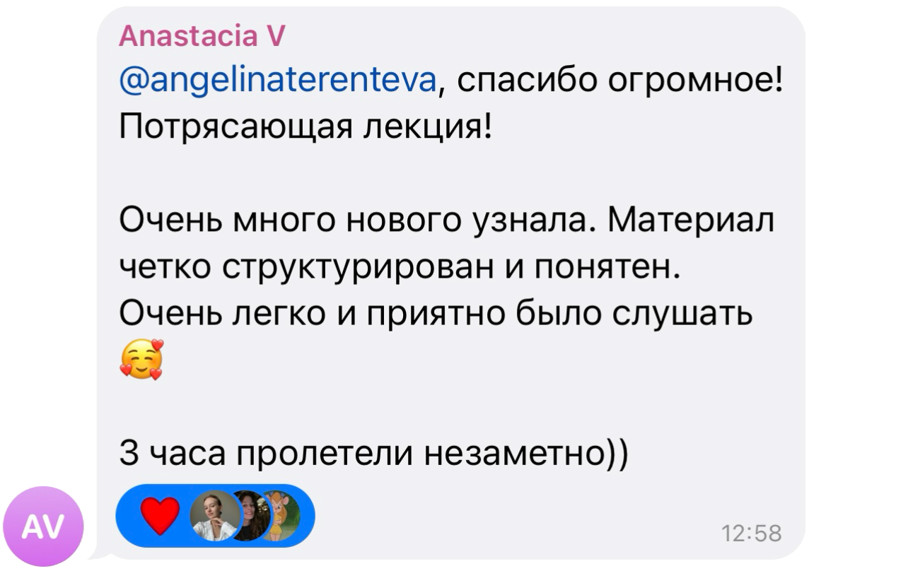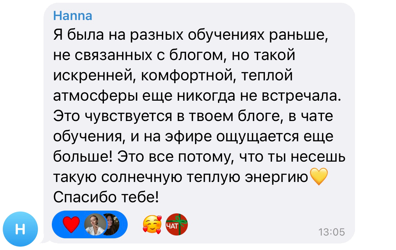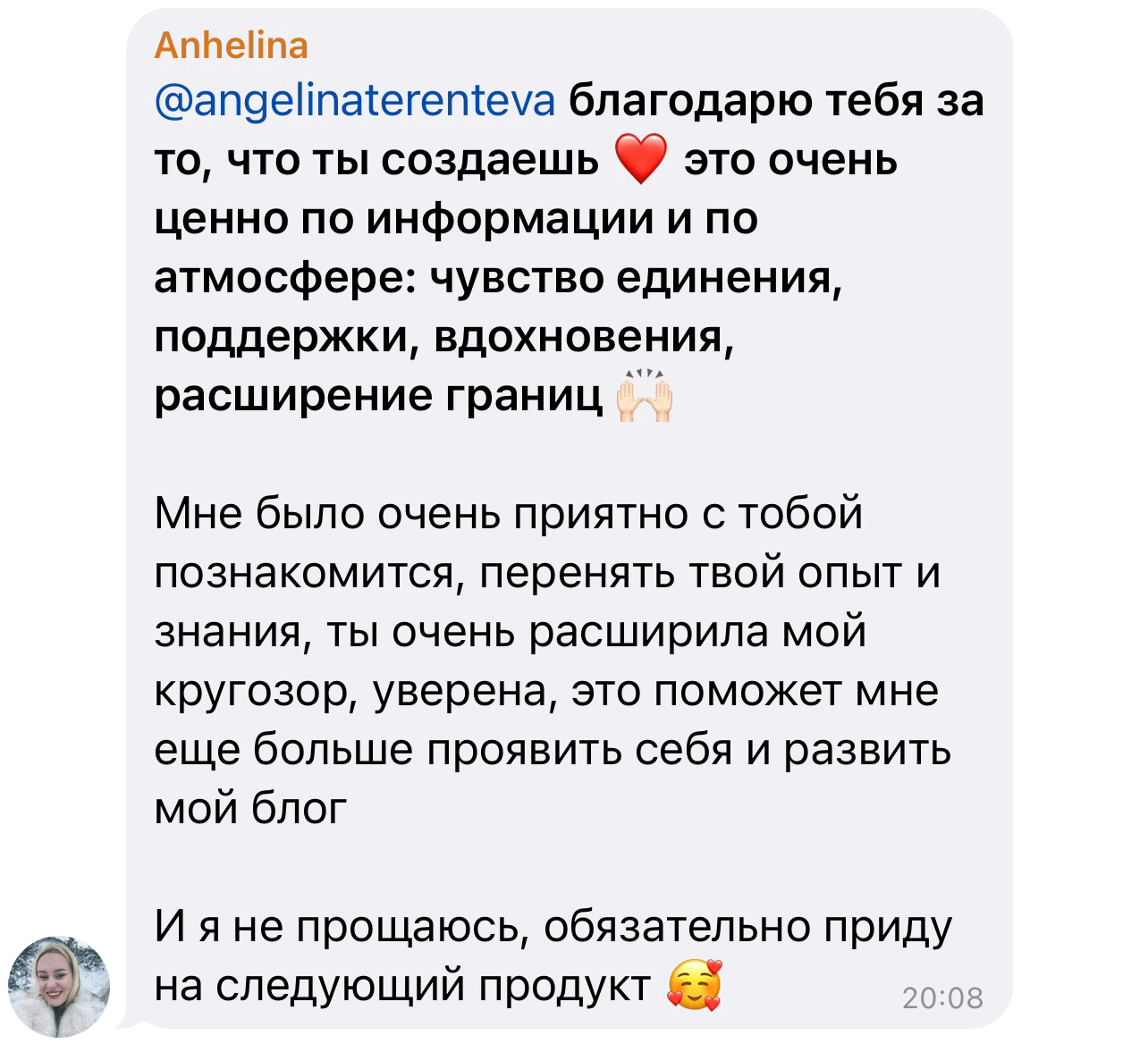 «Очень понравилась обратная связь и даже тот факт, что интенсив давно закончился, а чат до сих пор жив, и Лина сама продолжает отвечать на сообщения»