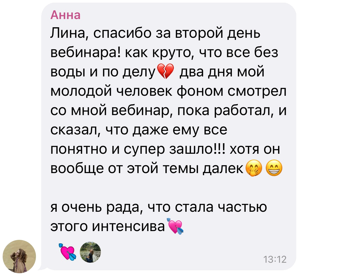 «Лина, твой вебинар был самым выгодным вложением, которое окупилось уже раз в 100!
